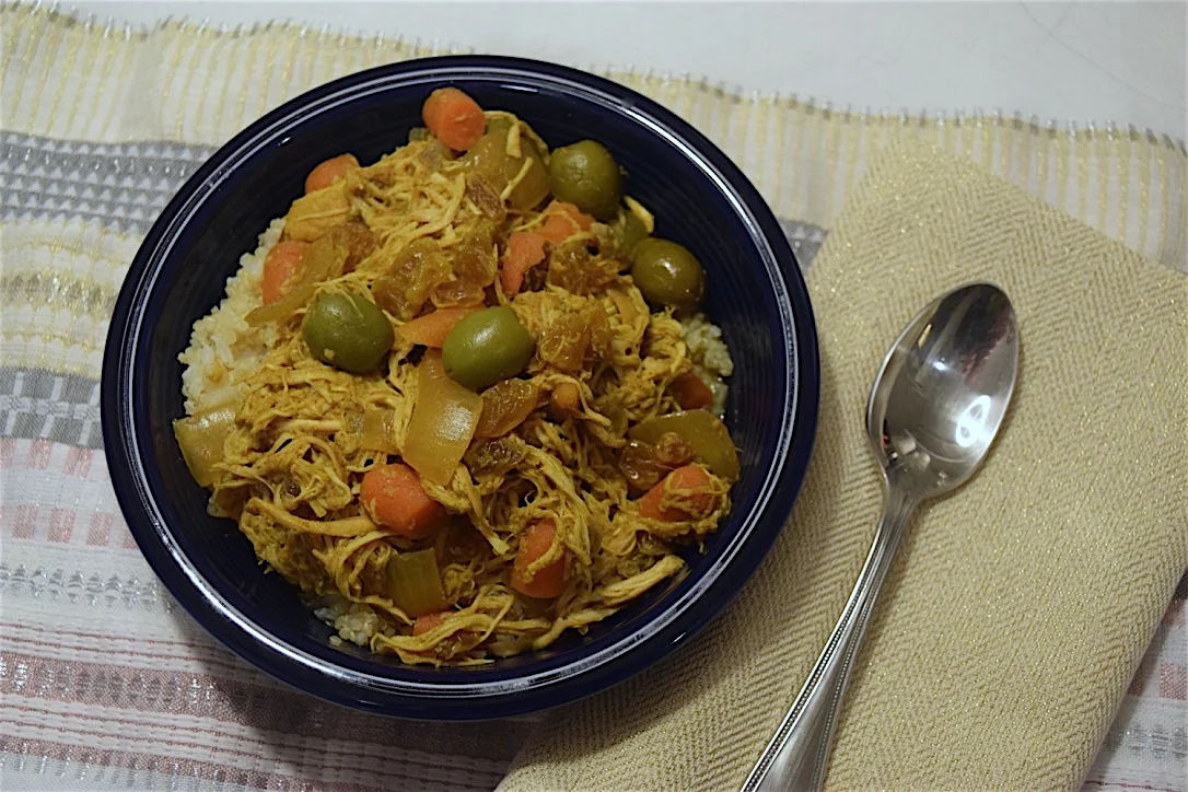 /Chicken tagine is one of our family's favorite dishes. The cumin, cinnamon, turmeric and cayenne, ginger and garlic fill the house with a spicy warmth as the Chicken, raisins, olives, carrots, and onions slowly stew together. It is such an easy meal and adds a nice balance to our regular menu of Asian, Mediterranean, and American fare.