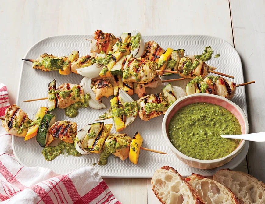 CHICKEN AND SQUASH KEBABS WITH ARUGULA PESTO