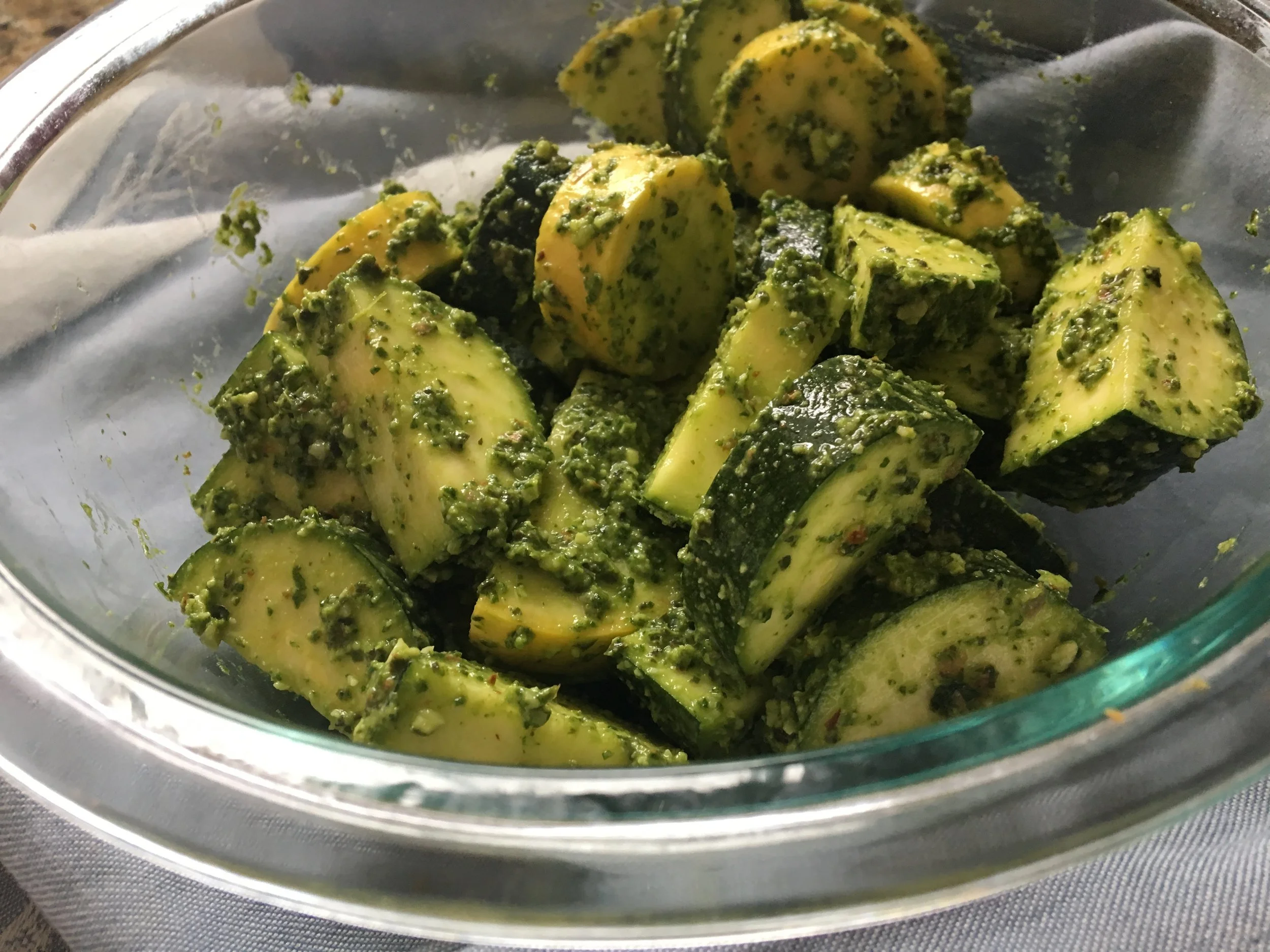 - Place vegetables in a bowl and toss in 2 Tbsp of arugula pesto.